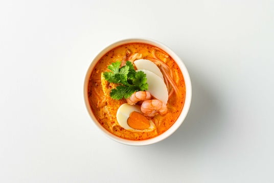スパイシーでありながらマイルド。ハーブの風味豊かなエビ出汁にココナッツミルクを合わせた濃厚なスープのライスヌードル。トッピングとしてエビ、かまぼこ、油揚げがのっています。