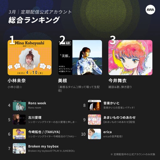 AWA株式会社(本社:東京都港区、代表取締役CEO:冨樫晃己)が運営する、サブスクリプション型(定額制)音楽ストリーミングサービス「AWA(アワ)」は、2025年3月1日(土)から3月31日(月)までに開催された、音声ライブ配信を利用した「定期配信ラウンジ」※の視聴数、開催頻度、リアクション数、フラワーチャット本数などを総合して、2025年3月の定期配信AWAラウンジランキングTOP10を発表いたしました。 ※定期配信中の公式ユーザーのみ対象 ■2025年3月定期配信AWAラウンジ人気ランキングTOP10