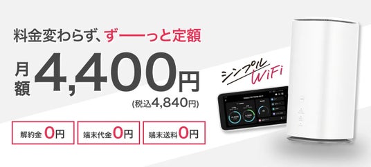 解約金0円、端末代金0円、端末送料0円。料金は変わらず、ずっと定額の月額4,400円(税込4,840円)。超シンプルなワンプランのみで構成されたWiFiサービスです。