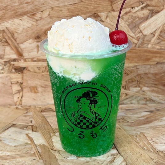 つるもちつるもちは、新食感の和スイーツ、わらび餅ドリンクを提供しております。北海道の希少な本わらび粉と、濃厚な沖縄黒糖を練りこんだ本格的なわらび餅を使用しています。今日は特別においし、なつかし、クリームソーダもご用意しています!味と食感の予想を超えていけ!一度ご賞味あれ!