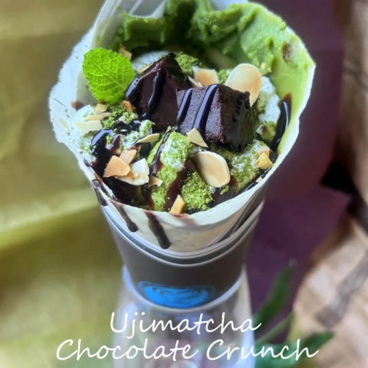 miu crepe cafeいちごパウダー、ココアパウダー、抹茶を生地に練り込んだ、もちもちでカラフルなおしゃれなクレープが特徴です。けずりいちご等その他スイーツも取り揃えております。