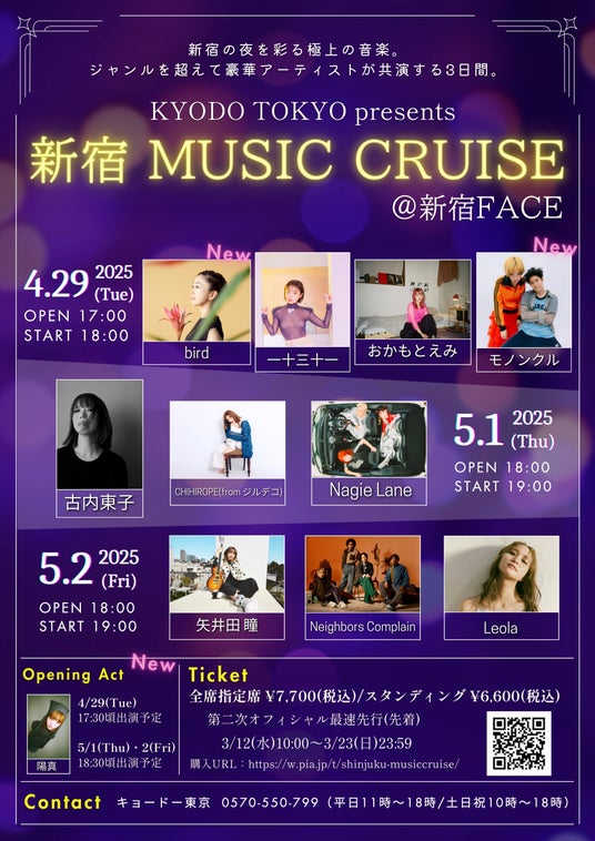 ジャンルを超えて豪華アーティストが共演する3日間「KYODO TOKYO presents 新宿MUSIC CRUISE」出演者最終決定!4/29公演にbird、モノンクルの出演が追加発表!!