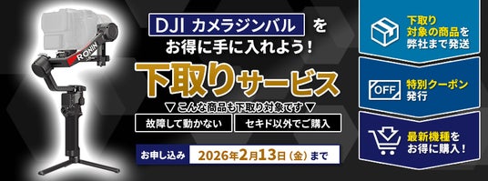 セキドでは、DJI RS 5をお得に購入できる下取りサービスを、2月13日(金)までの期間限定で実施します。各社スタビライザーを対象に、故障して動かない商品や、セキド以外で購入された商品も下取り対象です。プロレベルの映像制作環境をより手軽に実現したいクリエイターの方は、ぜひこの機会にご活用ください。