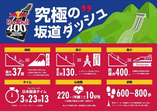 「Red Bull 400」は、世界で最も過酷と言われる坂道ダッシュレースです。2011 年にオーストリアで初めて開催され、日本では 2017 年を皮切りに今年で 8 回目の開催となります。毎年全国各地から参加者が集い、これまでに延べ 約9.000人以上がこの過酷なレースに挑戦してきました。最高斜度は富士山の山頂付近の傾斜(32 度~35 度)を超える 37 度、高低差は札幌市のシンボル「さっぽろテレビ塔」に匹敵する約130m に及び、心拍数は平常時の約 2 倍~3 倍まで上がると言われています。 2019 年にはレッドブル・アスリートでトレイルランナーの上田瑠偉選手が 3 分 23 秒 13 の最速記録を樹立しました。