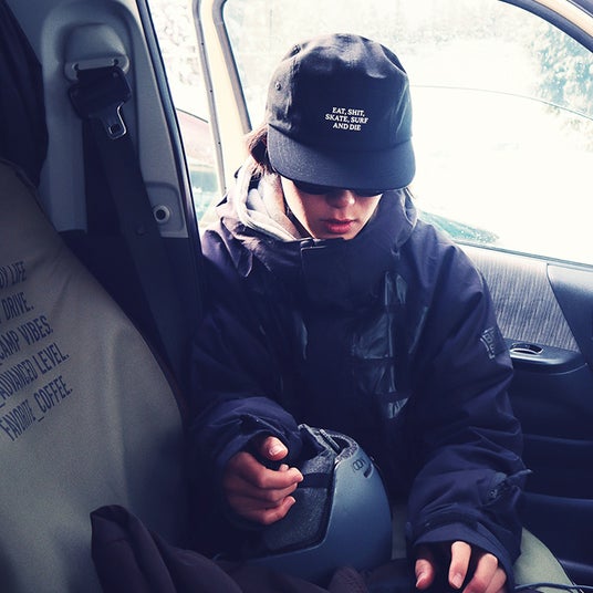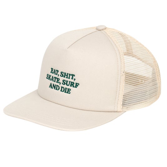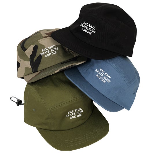 オリジナルデザインの5パネルJETキャップ。「Eat Shit and die(クソくらえ)」というスラングをアレンジしたフロントレターデザインには“どうせいつか終わりが来るなら、自分らしくやりたいことを全力で楽しもう”という意味を込めました。