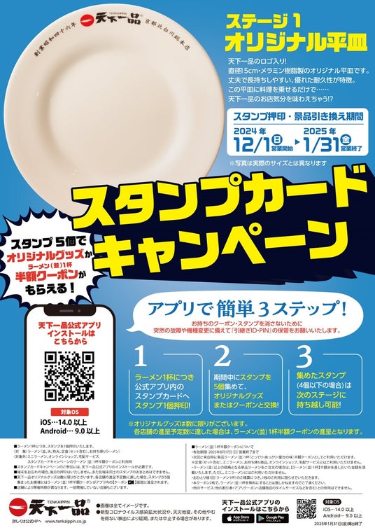 京都北白川発祥、鶏がらと野菜などをじっくり炊きだして作られたこってりスープが人気の中華そば専門チェーン店「天下一品」(本社:滋賀県大津市、グループ累計211店舗を展開中※)は、2024年12月1日(日)より全国の天下一品にて「アプリでスタンプカードキャンペーン ステージ1」を開催いたします。※2024年11月28日(木)時点での店舗数です。