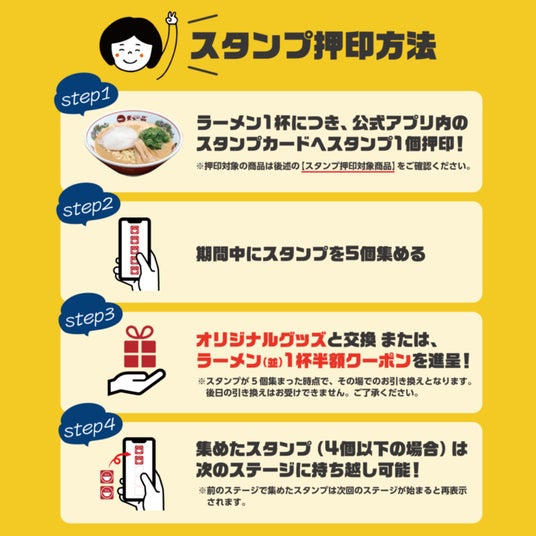 ※ラーメン(並)1杯半額クーポンのご利用方法につきましては、下記「アプリでスタンプカードキャンペーン」ページをご確認ください。