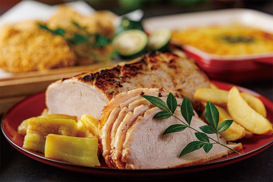 豚ロースの塊肉をじっくり3時間かけて真空調理した「豚肉の塩こうじ焼き」は表面に焼き色をつけることで中はしっとり、表面は香ばしく仕上げました。