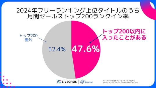 フリーランキング上位タイトルのうち47.6%の作品は、2024年の月間セールスランキングトップ200位入りしたことのあるタイトルでした。