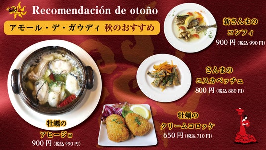 料理も店内の雰囲気も本場スペインのバル(Bar)を六本木に再現した「アモール・デ・ガウディ六本木店」では10月31 日(木)まで「秋のおすすめメニュー」4種を期間限定で販売しています。秋の定番、牡蠣とさんまを西洋風にアレンジしたオリジナルメニューをご用意いたしました。この機会に是非お楽しみください。皆様のご来店をスタッフ一同お待ちしております。
