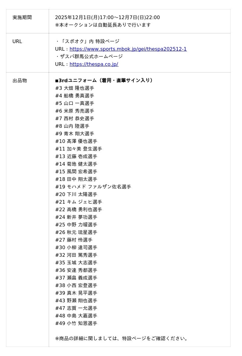 【ザスパ群馬 2025シーズン選手3rdユニフォームオークション 概要】