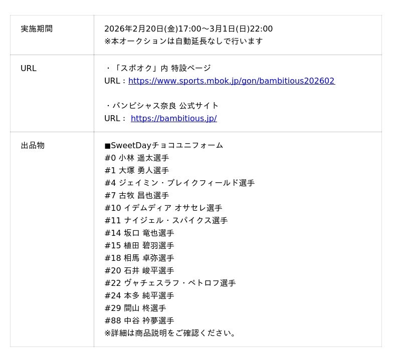 株式会社モバオク(本社:東京都渋谷区、代表取締役社長:小一原 宏樹、以下モバオク)がエンゲート株式会社(本社:東京都中央区、代表取締役:城戸 幸一郎、以下エンゲート)と業務提携し提供するスポーツチーム公式オークションサービス「スポオク」にて、B.LEAGUE所属のバンビシャス奈良が実施する『バンビシャス奈良 SweetDayチョコユニ 選手着用ユニフォームオークション』を2026年2月20日(金)から開始します。