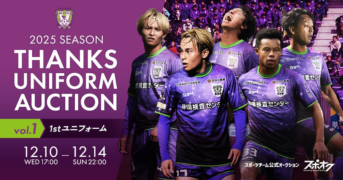 株式会社モバオク(本社:東京都渋谷区、代表取締役社長:小一原 宏樹、以下モバオク)がエンゲート株式会社(本社:東京都中央区、代表取締役:城戸 幸一郎、以下エンゲート)と業務提携し提供するスポーツチーム公式オークションサービス「スポオク」にて、J.LEAGUE所属の藤枝MYFCは『藤枝MYFC 2025 SEASON THANKS UNIFORM AUCTION Vol.1』を2025年12月10日(水)から開始します。