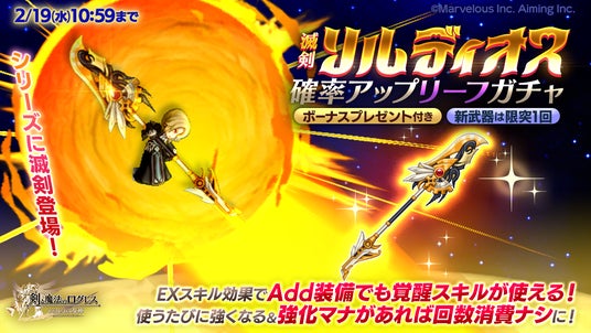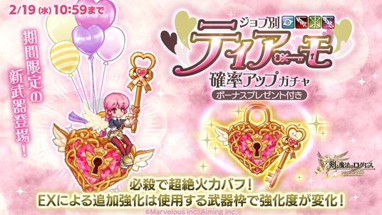 株式会社マーベラス(代表取締役社長:佐藤 澄宣/所在地:東京都品川区)は、スマートフォン向け本格オンラインRPG『剣と魔法のログレス いにしえの女神』において、2025/2/1(土)に新武器がラインナップした「ジョブ別 ティアーモ確率アップガチャ」の販売、2025/2/5(水)に「スイートバトルグランプリ」のクエスト追加を含むアップデートを行ったことをお知らせいたします。