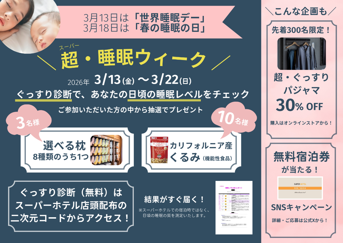 「Natural, Organic, Smart」をコンセプトとしたホテル運営を手掛ける株式会社スーパーホテル(所在地:大阪府大阪市、代表取締役社長:山本健策)は、3月13日の「世界睡眠デー」、3月18日の「春の睡眠の日」にあわせ、2026年3月13日(金)から3月22日(日)までの10日間、「超(スーパー)・睡眠ウィーク」を全国のスーパーホテル店舗および公式SNS上で実施いたします。