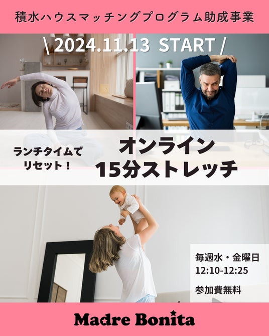 産後ケアの普及を通じて「産後を起点とする社会問題(産後うつ/乳児虐待/夫婦不和)の解決」を目指す、認定NPO法人マドレボニータ(東京都渋谷区、共同代表理事 中桐昌子・山本裕子)は、このたび積水ハウスマッチングプログラムの助成を受けて、産前・産後女性以外にも広く一般の方々も対象にした、セルフケアの普及啓発のための「ランチタイムでリセット!オンライン15分ストレッチ」を来年3月までの予定で開催します。