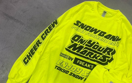 SNOW BANK創設当初から掲げるスローガン「PAY IT FOWERD」=「自分が受けた善意を他の誰かに渡すことで、善意をその先につないでいくこと。」と、自分たちがスタートラインに立ち活動を広めていこう、という意味を込めた「ON YOUR MARKS」 =「位置について」というスローガンに加え、