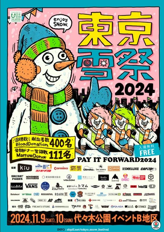 「東京雪祭り2024」は、普段献血ルームに足を運ばない若者に献血・骨髄バンクを知って行動してもらうキッカケの場づくりとして開催されるフェスイベントです。FREAK’S STOREは、献血・骨髄バンク若手ドナーの不足の課題解決のため、一般社団法人SNOWBANKと2017年から『楽しいから始まる社会貢献』をテーマに活動しています。