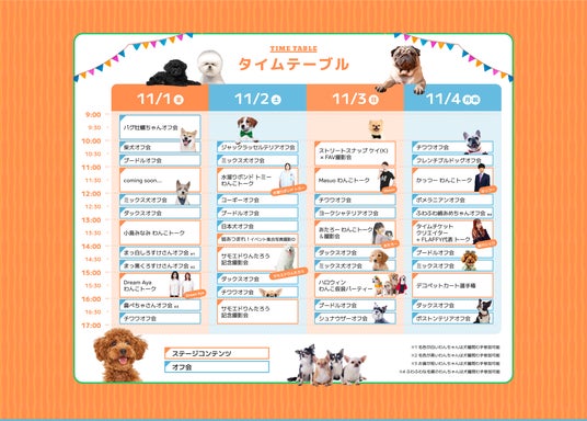 ステージコンテンツではスペシャルゲストによるトークショーや撮影会が行われます。犬種別オフ会も開催するので、ぜひご参加ください。