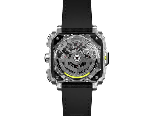 この効果に加えて、ケースバックは全面にサファイアクリスタルが使われており、何にも遮られることなく「キャリバーTH81-00」の雄姿を堪能できます。シグネチャーのタグ・ホイヤー シールドの形をしたローターが、ムーブメントの中で浮かんでいるかのような印象を与え、奥行き感と軽やかさを強調しています。完璧な対称性を備えたこのローターは、輪郭を際立たせるサテン仕上げが手作業で施されています。また、タグ・ホイヤーの象徴であるチェッカーフラッグパターンが手作業で刻まれており、この装飾がムーブメント内部の複雑な構造に新たな視覚的レイヤーをプラスし、緻密なディテールを際立たせています。 また、レーシングカーのカラーリングにさりげなく捧げるオマージュとして、このタイムピースに明確なグラフィックアイデンティティをもたらしているのが、ハンドペイントのストライプ。隣接するテンプブリッジにはサテン仕上げだけでなく、手作業で丁寧にポリッシュ仕上げされた面取りが施され、技術的な精度と熟練のクラフツマンシップとの間で静かに対話を繰り広げています。 ローターにそれぞれのシリアルナンバーが刻印されたこのタイムピースには、チタン製バックルでテキスタイルパターンが施されたハンドステッチのブラックカーフストラップが組み合わされています。 「タグ・ホイヤー モナコ スプリットセコンド クロノグラフ」の最終的な仕上がりには、タグ・ホイヤーのアヴァンギャルドなDNA、そして既成概念を受け入れることを拒み、物事をよりと生き生きと、時代や環境の変化に柔軟に対応しながら表現力豊かに再構築するブランドの姿勢が反映されています。