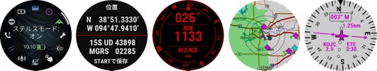 左から、ステルスモード、デュアルポジションフォーマット、レッドシフトモード、METAR&TAF気象レポート、直接ナビゲーション