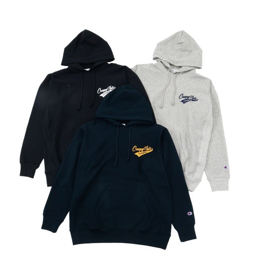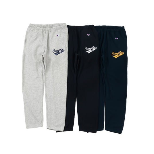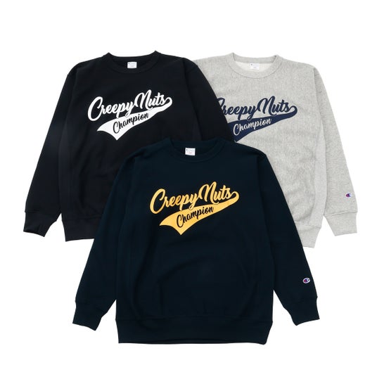 Creepy NutsとChampion を、アメリカのメジャースポーツでみられる文字とリボンで組み合わせたグラフィックをプリントや刺繡で入れたクルーネックスウェットシャツ、フーデッドスウェットシャツ、スウェットパンツをオックスフォードグレー、ネイビー、ブラックの3色展開。