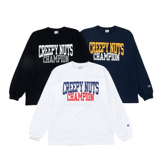 ドライな着心地のロングスリーブTシャツは、Creepy NutsとChampion を2段組みのブロックフォントを使用し、アメリカのメジャースポーツのチームカラーをイメージした2色のカラーのラバープリントでホワイト、ネイビー、ブラックの3色展開。