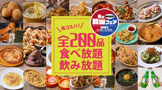 フェア期間中に下記の対象プランをご注文いただくと、人気の「チーズボール」や「ヤンニョムチキン」はもちろん、「チュクミサムギョプサル」「極太春雨~タンミョン~」「旨辛チーズビビンバセット」「韓国チョコワッフル」など、話題の人気韓国グルメも食べ放題に!