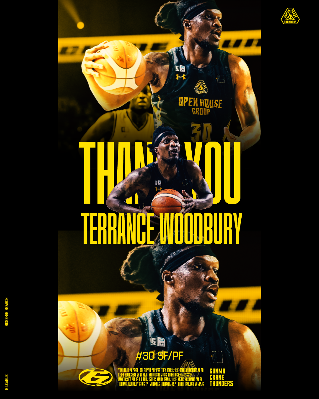 この度、群馬クレインサンダーズでは、契約満了のため、#30 テレンス・ウッドベリー選手が退団することとなりましたのでお知らせいたします。