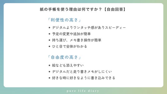 「スケジュール管理のため」というより、振り返りや記憶に残しておく、自分と向き合えるという点で、紙の手帳の良さを感じていることがうかがえました。また、自由回答からは、デジタルよりも利便性の高さ、記入の自由度に魅力を感じているユーザーがいることが分かりました。