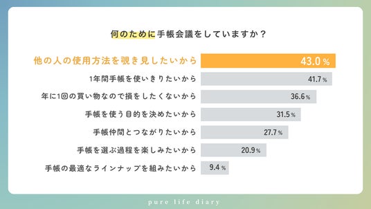 「何のために手帳会議をしていますか?」という設問に対し、1番多かった回答は「他の人の使用方法を覗き見したいから」で43.0%、次いで「1年間手帳を使い切りたいから」で41.7%、「年に1回の買い物なので損をしたくないから」36.6%でした。