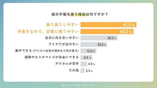 紙の手帳を使う理由を聞いたところ、1番多かった回答が「振り返りしやすい」で41.5%、次いで「手書きなので、記憶に残りやすい」で40.2%、「自分に向き合いやすい」28.2% という結果でした。