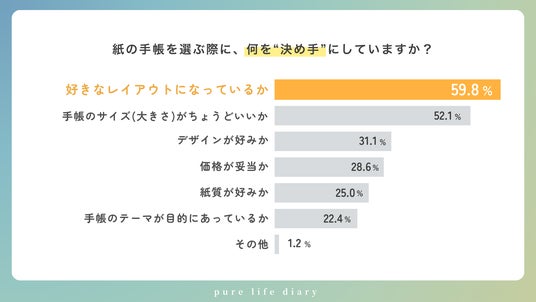 紙の手帳を選ぶ際の“決め手”を聞いたところ、1位は「好きなレイアウトになっているか」で59.8%、次に「手帳のサイズ(大きさ)がちょうどいいか」52.1%、「デザインが好みか」31.1%でした。