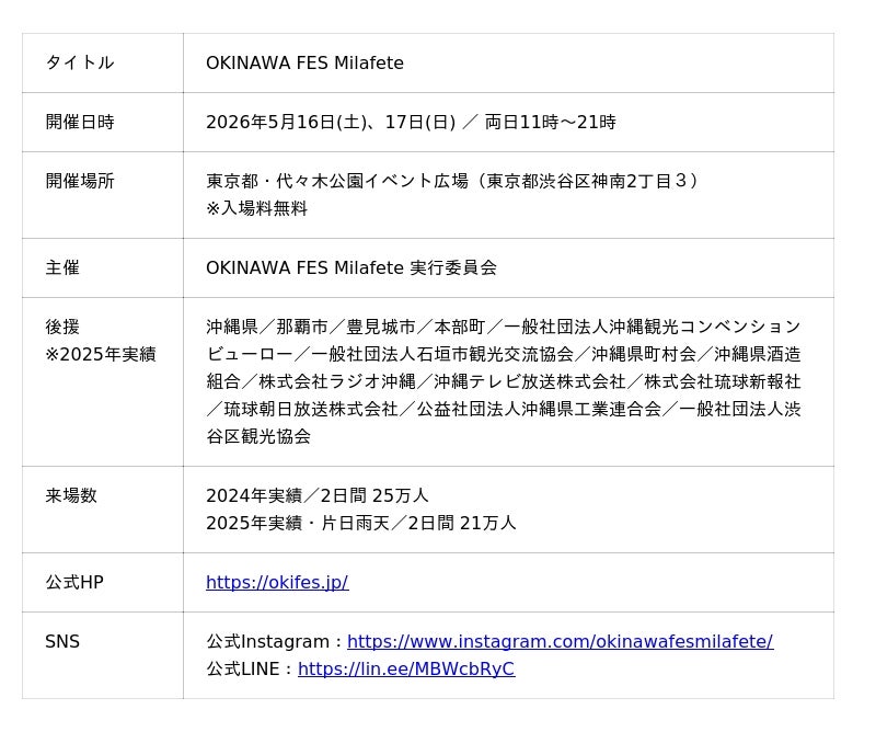 ミラフェート株式会社(所在地:沖縄県那覇市、代表取締役:笠井誉文)は、通算11回目、10周年を迎える「OKINAWA FES Milafete(オキナワフェス ミラフェート)」において、2026年5月16日(土)・17日(日)の2日間、東京都・代々木公園イベント広場にて開催される本イベントの全出演アーティストの発表を行ったことをお知らせいたします。