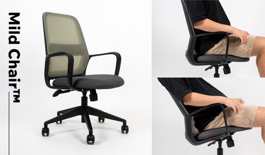 Mild Chair人間工学に基づいたデザインで、腕のラインに沿った滑らかな曲線の肘掛けが自然な姿勢をサポート。 リング状になっている肘掛けは背もたれと一体化し、身体を全方位から支えます。
