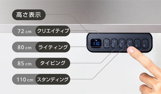 自分の習慣に合わせて4つの高さを記憶し、ワンクリックで理想の高さに。 毎回手動で調整する手間が省け、作業効率が大幅にアップします。
