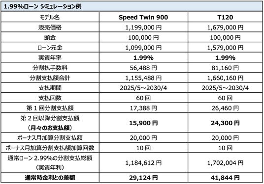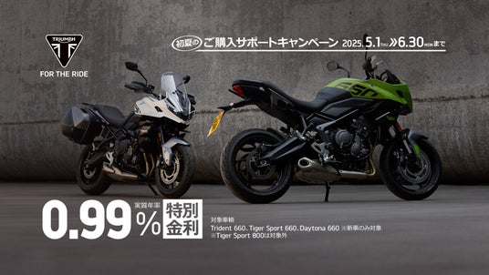 0.99%特別低金利ローン:期間中、全国のトライアンフ正規販売店にて対象車両をご成約、且つローン契約を完了していただいたお客様に、「0.99% 特別金利ローン」をご提供します。