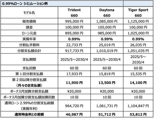■Trident 660、Tiger Sport 660 、Daytona 660 0.99%特別金利ローン キャンペーン