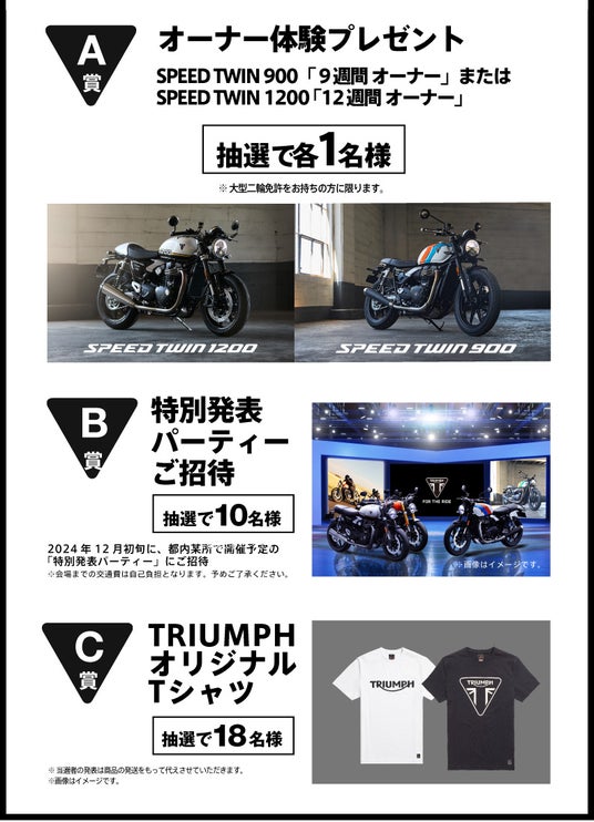 本キャンペーンでは、先日、日本導入を正式発表した新型 Speed Twin 900や、新型 Speed Twin 1200を長期間に渡ってモニターできる「オーナー体験」をはじめ、12月初旬に予定されている、関係者のみが出席できる「特別発表パーティー」へのご招待、そしてトライアンフオリジナルTシャツのプレゼントなど、抽選で合計30名様に特別な賞品をプレゼントいたします。