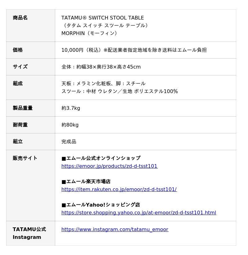 人間工学に基づいた空間有用性と安全な使い心地を両立するトランスフォーム家具ブランドTATAMU(R)を展開する株式会社エムール(東京都立川市:代表取締役 高橋 幸司)は、2026年4月2日より、スタッキングできるスツール&テーブル「MORPHIN(モーフィン)」(以下、モーフィン)の販売を開始しました。