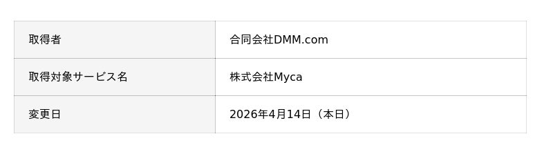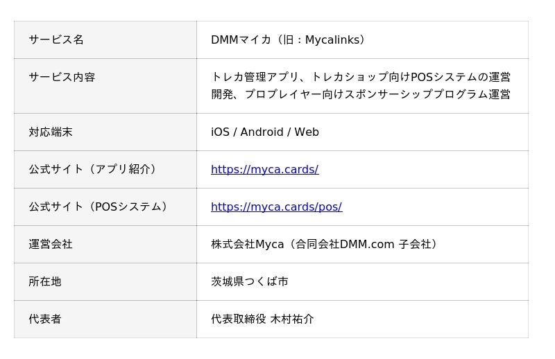 合同会社DMM.com(本社:東京都港区、以下「DMM」)は、トレーディングカード管理・購入アプリ「Mycalinks(マイカリンクス)」を運営する株式会社Myca(本社:茨城県つくば市、以下「Myca」)の発行済株式を取得し、子会社化したことをお知らせいたします。