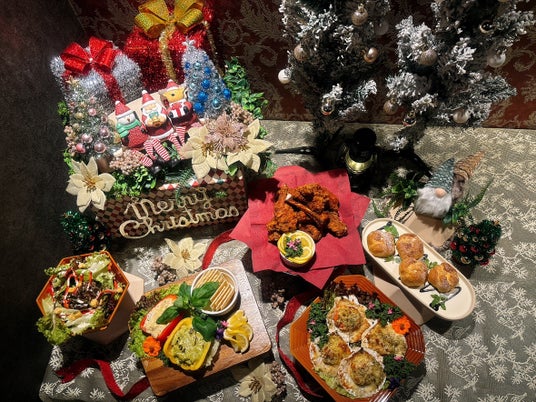 オリジナルスパイスを加え豚のスペアリブを揚げたフライドスペアリブはジューシーで食べ応え抜群!他にも、ホタテの香草焼きやパプリカを器にしたディップクラッカーなど色とりどりのメニューでもてなします。クリスマスにもぴったりで写真映え抜群です。