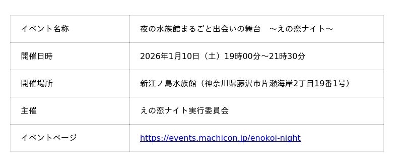 株式会社リンクバル(本社:東京都中央区、代表取締役社長:吉弘和正、証券コード:6046、以下「リンクバル」)が運営するイベントECサイト「machicon JAPAN」は、2026年1月10日に神奈川県の「新江ノ島水族館」にて最大1,000名規模で開催される【夜の水族館まるごと出会いの舞台~えの恋ナイト~、以下「本イベント」】の掲載を開始いたしました。