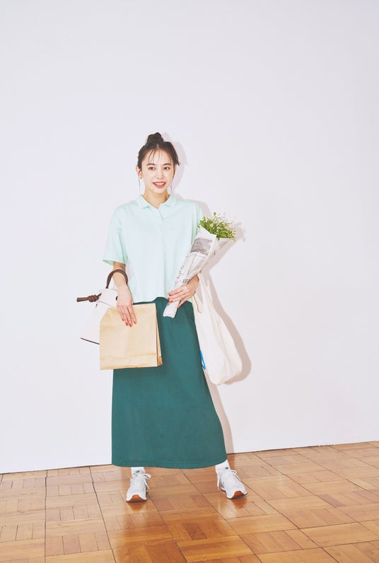トップスは春先にぴったりの軽やかなカラーリングに、パンツは裾が絞れるボリューム感のあるシルエットでトレンド感を演出します。