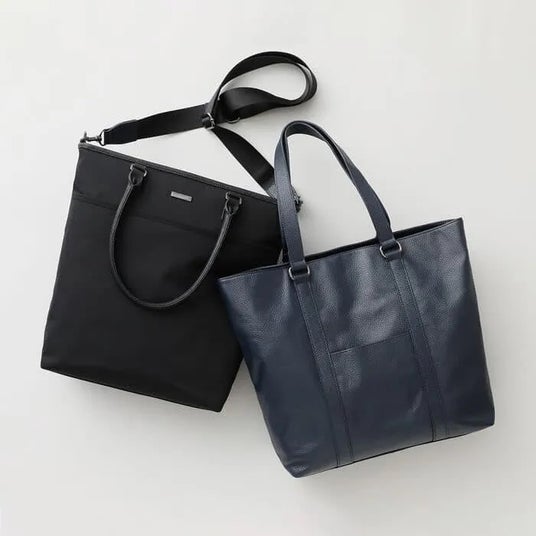 ベーシックなデザインで使いやすいNEWYORKERのトートバッグ。丈夫で汚れにくいコーデュラナイロン素材は、電車通勤でも場所を取らない縦型。ネイビーのレザー素材は落ち着きがありつつ、抜け感のあるコーディネートに演出します。