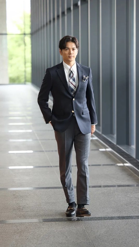 オーセンティックな梳毛のネイビーブレザーにグレースラックスといった王道コーディネートをドレスアップ。ニューヨーカータータン柄のネクタイが目を惹き華やかな印象に。足元はビットローファーでクラシカルに演出しました。