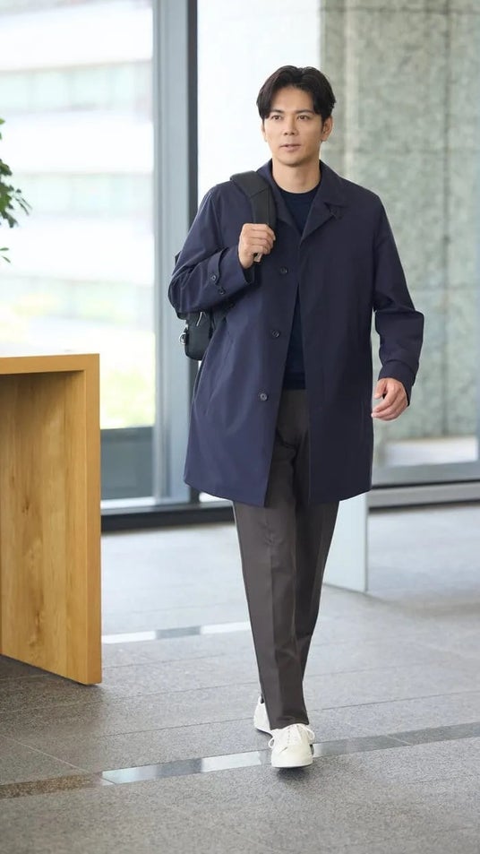 機能的なマックコートにクルーネックニットとカジュアルスラックスを合わせた、シンプルで潔いコーディネート。スラックスはウエストシャーリング仕様でラクチンかつ、すっきりとしたシルエットで汎用性も高く、この秋新しいパンツをお探しの方は必見です。