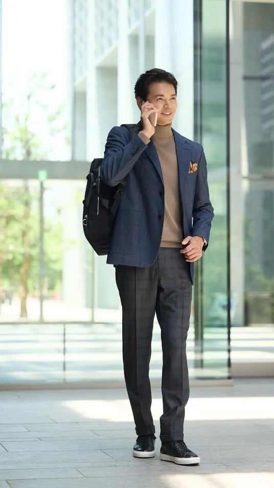 取引先訪問など、外出や移動が多いアクティブなビジネスマンに向けた「MOVING COMFORT」シリーズのカジュアルジャケット。ウォーム感がありながらコットンベースで軽い仕様がポイントです。タートルネックニットとスニーカーでモダン&スポーティーにまとめました。