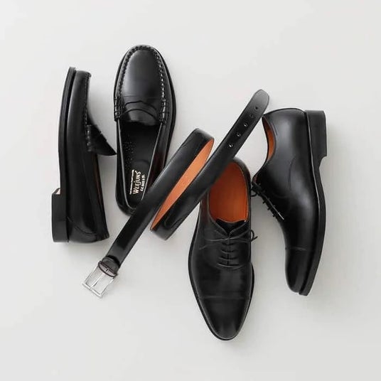 コーディネートを印象付ける大事なシューズと革小物。今シーズンは、汎用性の高いブラックカラーのレザーシューズをNYオンライン限定でご用意。高級感のあるコードバンのベルトでコーディネートを格上げして。
