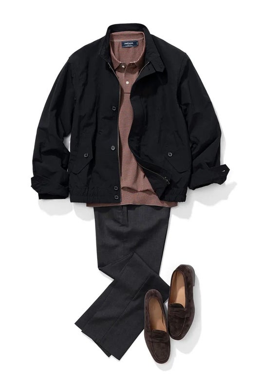 時代を超えて人気のある「ハリントンアウター(スウィングトップ)」を、リサイクルナイロン素材にアップデート。特徴的な立ち襟とリブ仕様の裾口、短めに設定された着丈が特徴。クラシカルなディテールは踏襲しつつ、裏地をベンチレーションに変更して、高温多湿な日本の気候でも快適に着用いただける仕様に調整しました。春や秋に軽く羽織ることができ、シンプルながらスタイリッシュな印象を与えるアウターです。